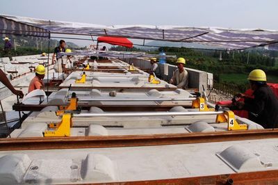 ②、鋼軌高低位置負(fù)調(diào)整時,應(yīng)先卸下錨固螺栓,提升鋼軌。